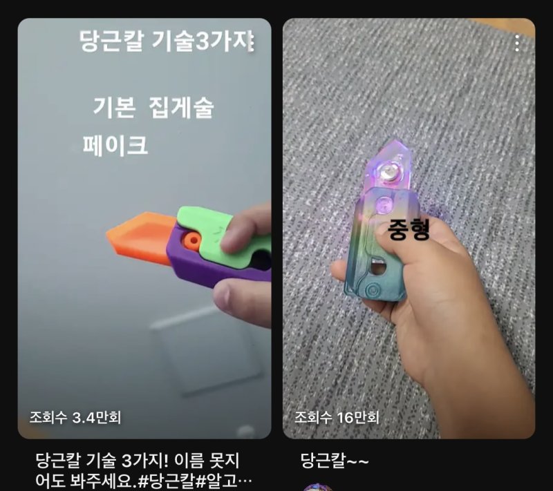 SNS와 유튜브 등에서 당근칼을 검색하면 ‘당근칼 기술’, ‘당근칼 멋있게 돌리는 법’을 안내하는 문구가 연관 키워드로 나열된다. 특히 10대가 많이 이용하는 플랫폼인 틱톡에서 당근칼 관련 영상이 큰 인기를 얻고 있다.
