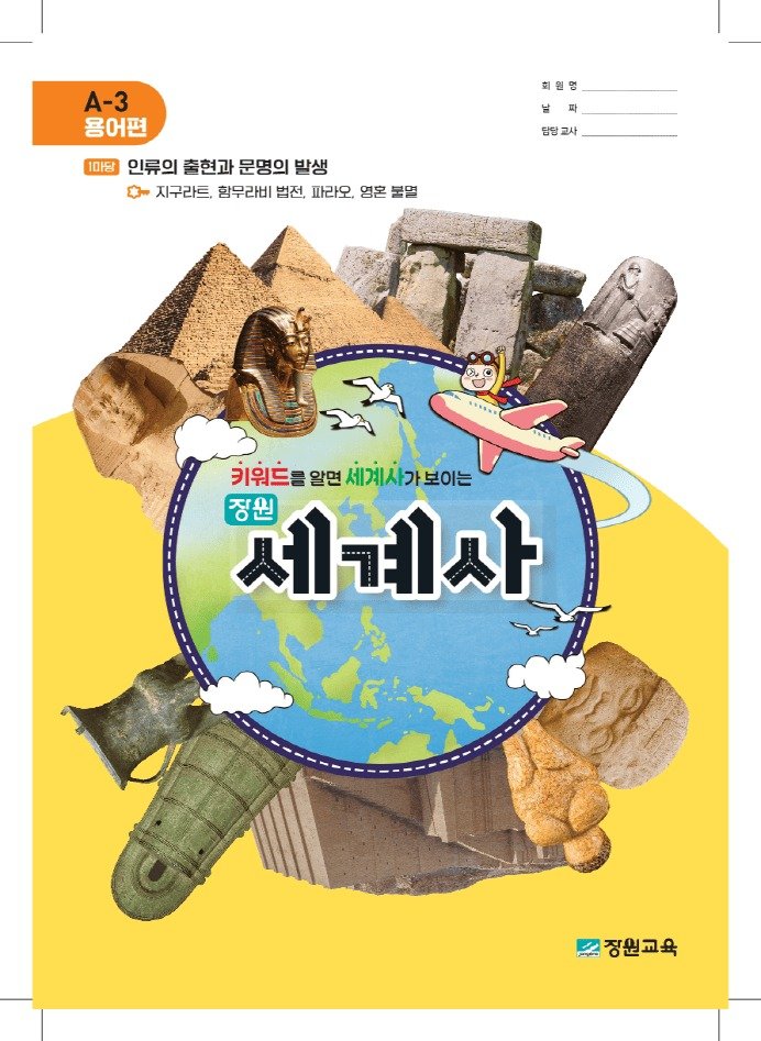 장원세계사는 정치·경제·문화사를 중심으로 선사시대에서 근현대까지 다룬 주간 학습지다. 총 4개 과정, 105주 학습으로 구성됐다.
