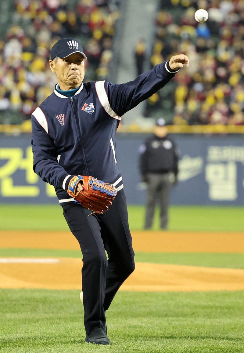 김 감독은 13일 서울 잠실구장에서 열린 2023 신한은행 SOL KBO 한국시리즈(7전 4선승제) 5차전 KT 위즈와의 경기를 앞두고 김응용, 김인식 감독과 함께 합동 시구에 나섰다.