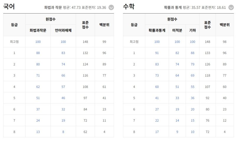 지난해 치러진 2023학년도 수능의 최고 표준점수는 국어 134점, 수학 145점이다. 그 직전인 2022학년도 국어는 149점, 수학은 147점으로 '용암 국어'로 불린 해다.