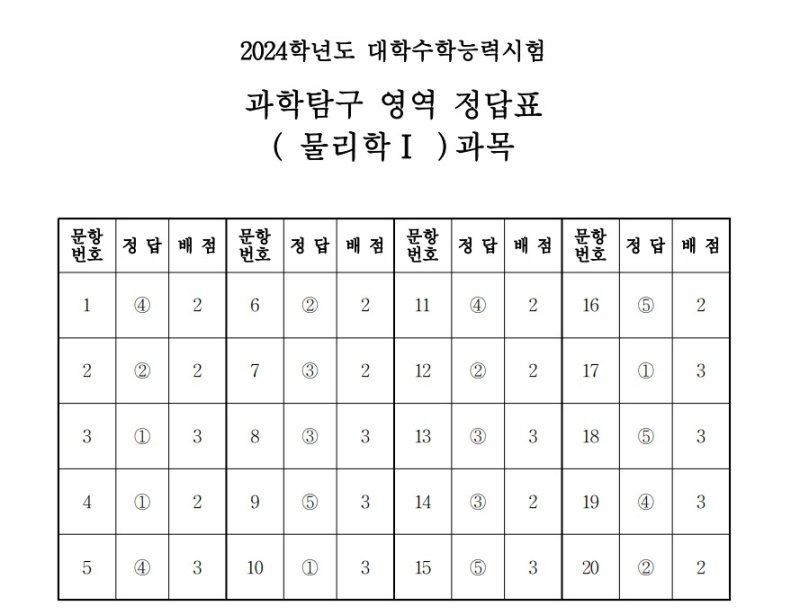 2024학년도 대학수학능력시험 4교시 과학탐구영역 '물리학I' 정답표(한국교육과정평가원 제공) 2024학년도 대학수학능력시험 4교시 과학탐구영역 '화학I' 정답표(한국교육과정평가원 제공) 2024학년도 대학수학능력시험 4교시 과학탐구영역 '생명과학I' 정답표(한국교육과정평가원 제공) 2024학년도 대학수학능력시험 4교시 과학탐구영역 '지구과학I' 정답표(한국교육과정평가원 제공) 2024학년도 대학수학능력시험 4교시 과학탐구영역 '물리학II' 정답표(한국교육과정평가원 제공) 2024학년도 대학수학능력시험 4교시 과학탐구영역 '화학II' 정답표(한국교육과정평가원 제공) 2024학년도 대학수학능력시험 4교시 과학탐구영역 '생명과학II' 정답표(한국교육과정평가원 제공) 2024학년도 대학수학능력시험 4교시 과학탐구영역 '지구과학II' 정답표(한국교육과정평가원 제공)