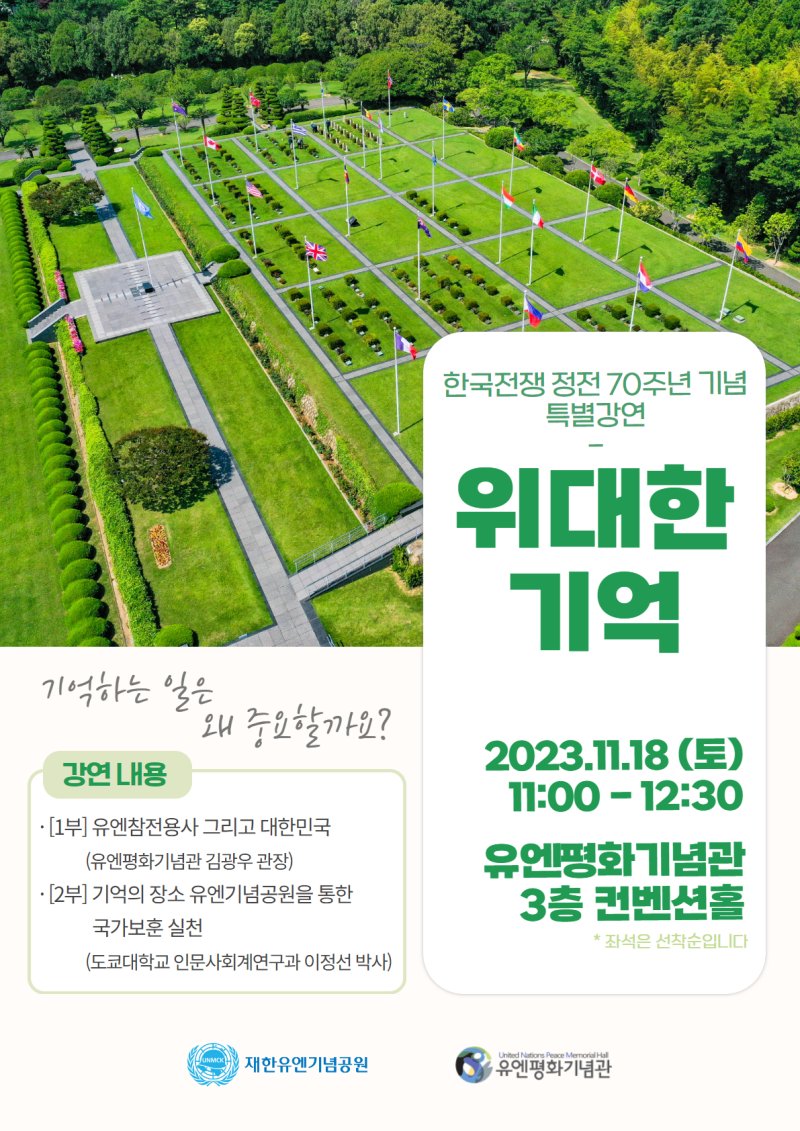 한국전쟁 정전 70주년을 기념하는 이번 강연은 유엔참전용사들의 희생과 헌신을 기억하고, 유엔기념공원의 의미를 다시 한 번 생각해보는데 초점을 둔다.
