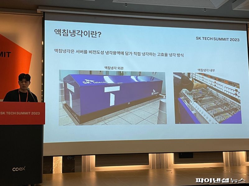 최우신 SK텔레콤 인프라 엔지니어링팀 매니저는 17일 서울 강남 코엑스에서 열린 'SK 테크 서밋 2023'에서 "테스트 결과 (액침냉각 방식에서) 기존 방식 대비 냉방전력의 93%, 서버전력에서 10% 이상이 절감돼 총 37%의 전력이 절감되는 효과를 확인했다"며 이같이 말했다.