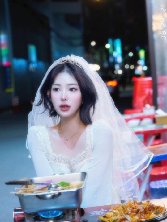 화보에서 최준희는 새하얀 면사포와 웨딩드레스를 입고 한 야외 음식점에서 다양한 포즈를 취했다. 최준희는 "포차 한복판에서 저를 보고 놀라신 분들 죄송하다"며 "작가님 너무 작업물 너무 이쁘다. 크리스마스 때 보아요"라고 했다.