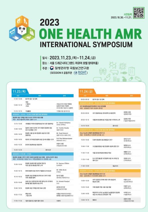 국제보건기술연구기금(RIGHT foundation)과의 공동 세션으로 기획된 '항생제 내성을 다루기 위한 차세대 글로벌 연구개발(R&D) 현황' 세션에서는 글로벌 항생제 연구개발(R&D) 파트너십(GARDP), 혁신적 진단기기 재단(FIND), 한국 파스퇴르 연구소, 국제백신기구(IVI), 국립보건연구원 소속의 연자들이 항생제 내성 감시, 진단, 치료 분야에 대한 국제 동향을 발표할 예정이다.