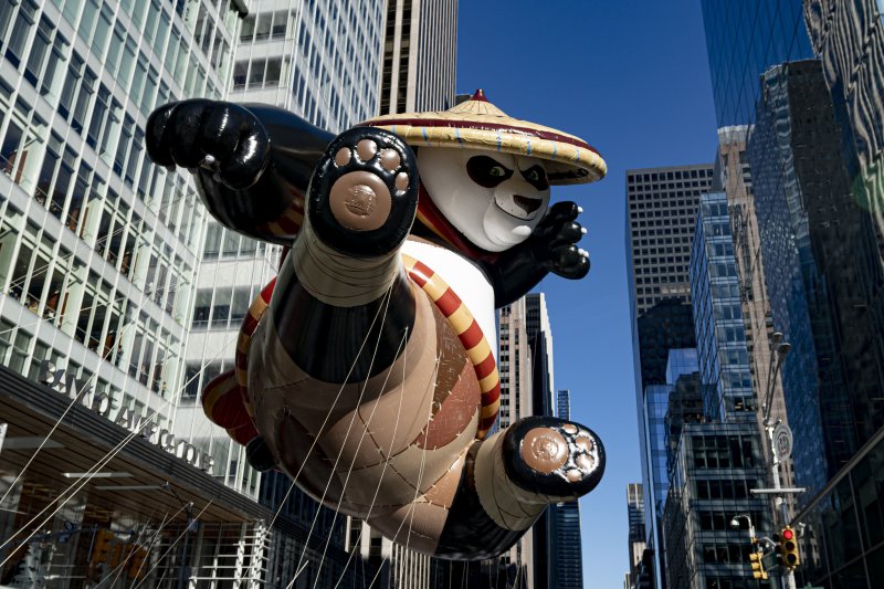 [뉴욕=AP/뉴시스] 추수감사절인 23일(현지시각) 미국 뉴욕에서 제97회 메이시스 추수감사절 퍼레이드가 열려 쿵푸 팬더 풍선이 날아 차기를 시전하고 있다. 2023.11.24. [서울=뉴시스] 류현주 기자 = 23일(현지시간) 미국 뉴욕에서 메이시스 추수감사절 퍼레이드가 열렸다.