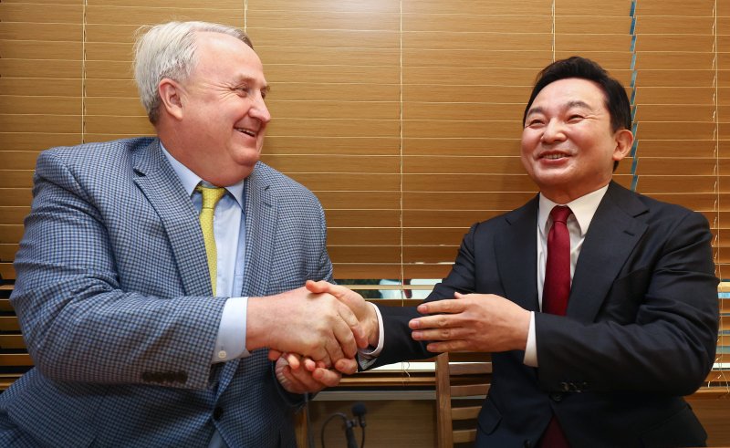 [서울=뉴시스] 김금보 기자 = 인요한 국민의힘 혁신위원장과 원희룡 국토교통부 장관이 25일 서울 영등포구 여의도 한 식당에서 오찬 회동에 앞서 인사를 나누고 있다. (공동취재사진) 2023.11.25. photo@newsis.com 인요한 국민의힘 혁신위원장과 원희룡 국토교통부 장관이 25일 서울 영등포구 여의도에 위치한 한 식당에서 원 장관과 30분간 만나 오찬회동을 진행했다.
