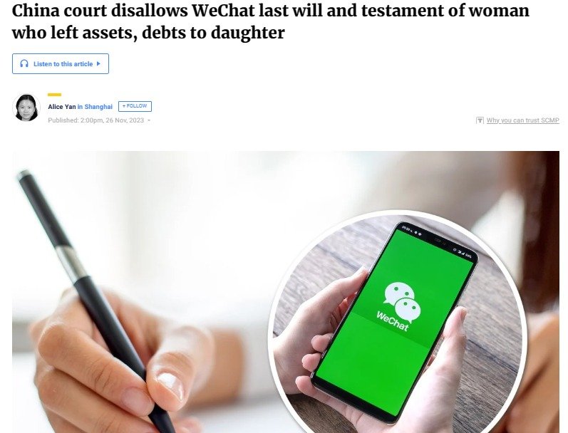 상하이 황푸 인민법원은 이번 사건에 대해 위챗에 올라온 유언장은 법적 효력이 없다고 판단했다. 법원은 위챗 유언이 중국 민법에서 법적으로 인정하는 6가지 형태의 유언장에 포함되지 않는다고 판결 이유를 밝혔다.