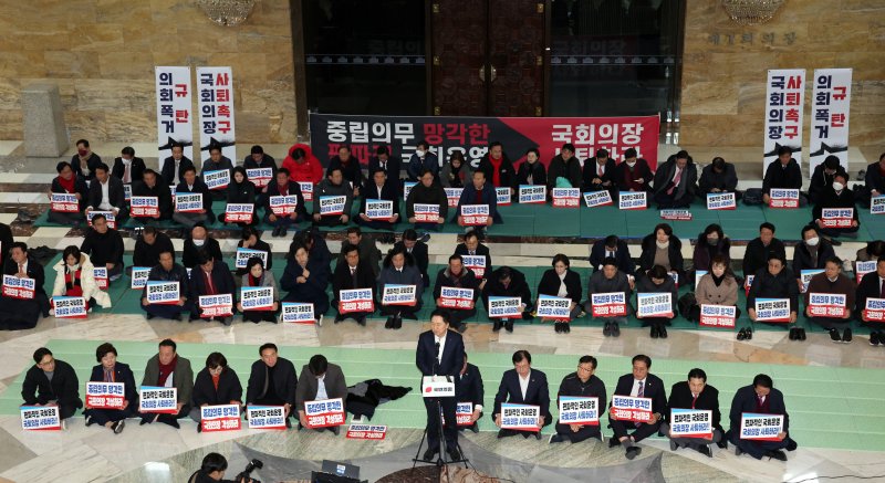 국회 로텐더홀에는 이날 오후 9시부터 국민의힘 의원 70여명이 모여 '중립의무 망각하는 국회의장 각성하라', '탄핵중독 의회폭거 민주당은 각성하라' 등이 쓰인 피켓을 들고 농성을 시작했다. 추운 날씨에 두꺼운 패딩과 목도리를 한 의원들도 많았다. 빨간색 패딩 차림의 정진석 의원은 밤새 읽을 책과 이어폰을 챙겨온 모습이 눈에 띄었다.