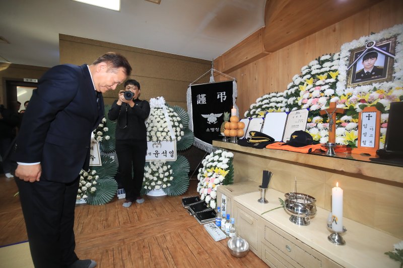 빈소를 나온 이 장관은 "고 임성철 소방장의 희생을 계기로 대한민국 국민들의 안전을 위해 마지막 피와 땀을 흘려서 안전한 대한민국을 만들도록 열심히 노력하겠다"고 밝혔다.