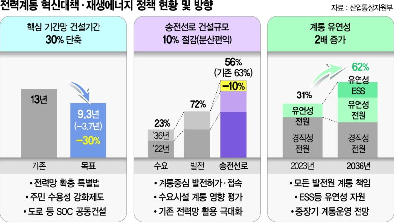 정부는 이에 전력계통 혁신 추진전략을 통해 원전과 신·재생 같은 무탄소전원(CFE) 확대에 대응한 전력망 구축에 나서기로 했다. 핵심 전력망 건설 기간을 30% 단축(13년→9.3년)한다. 전담팀이 인·허가 신속 협의와 제도 개선에 나서 동해안~수도권 초고압직류(HVDC) 송전선로를 목표한 2026년까지 완공시키고, 2036년 완공을 목표로 서해안 해저 HVDC 송전선로도 본격적으로 착수한다.