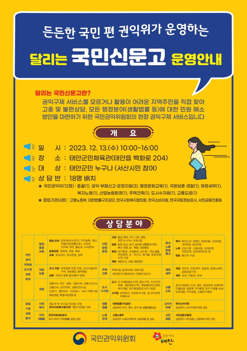 [태안=뉴시스]유순상 기자 = 충남 태안군은 오는 13일 태안군민체육관에서 국민권익위원회와 함께 주민들의 각종 고충사항을 상담을 해주는 ‘달리는 국민신문고’를 운영한다고 6일 밝혔다.