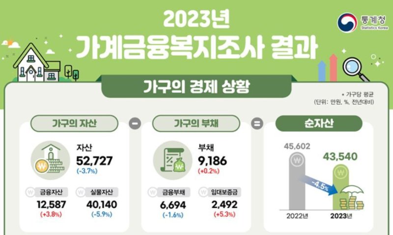 통계청이 한국은행, 금융감독원과 7일 발표한 '2023년 가계금융복지조사 결과'에 따르면 지난 3월 말 기준 국내 가구당 평균 자산은 5억2727만원으로 1년 전보다 3.7% 감소했다.