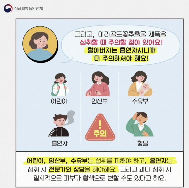 [서울=뉴시스]송종호 기자 = 마리골드꽃추출물(이하 루테인)은 노화로 약해질 수 있는 눈 건강에 도움을 주기도 하지만 흡연자, 임산부 등에서 부작용이 발생할 수 있어 섭취 시 주의가 필요하다.