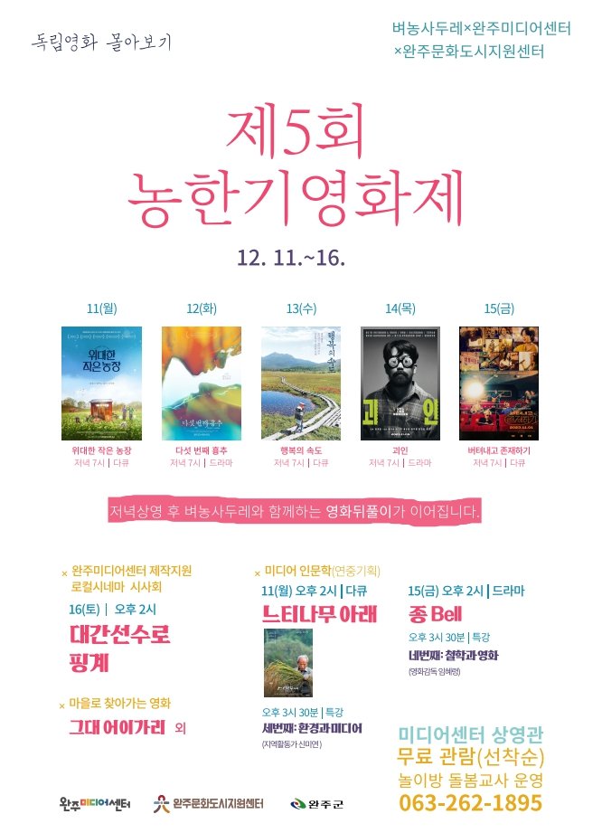 완주미디어센터와 완주문화도시지원센터가 지원하고 고산권벼농사두레가 진행하는 ‘제5회 농한기영화제’가 오는 11일부터 16일까지 완주미디어센터에서 열린다.