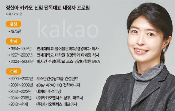 정 내정자는 "중요한 시기에 새로운 리더십을 이어받게 돼 더없이 무거운 책임감과 사명감을 느낀다"며 "사회의 기대와 눈높이에 맞출 수 있도록 성장만을 위한 자율경영이 아닌 적극적인 책임 경영을 실행하고 미래 핵심사업 분야에 더욱 집중하겠다. 카카오에게 주어진 시간이 많지 않기에 변화의 타이밍을 놓치지 않겠다"라고 전했다.