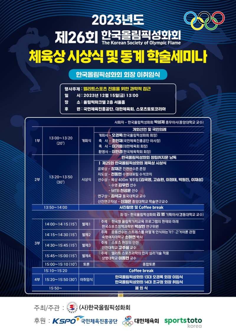 한국올림픽성화회는 15일 오후 서울 송파구 올림픽파크텔에서 제26회 체육상 시상식 및 동계학술세미나를 개최한다고 14일 밝혔다.