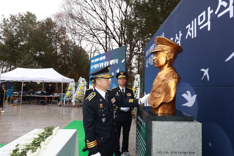 이날 오후 3시 충북 충주 중앙경찰학교 충의선양탑에서 진행된 '올해의 경찰 영웅 이강석 경정 흉상 제막식'에는 이 경정 배우자와 두 아들, 형제 등 유가족 12명과 홍기현 경기남부경찰청장, 최종문 경찰청 경무인사기획관, 주상봉 재향경우회 경기남부지회장, 중앙경찰학교 교육생 등 90여 명이 참석했다.