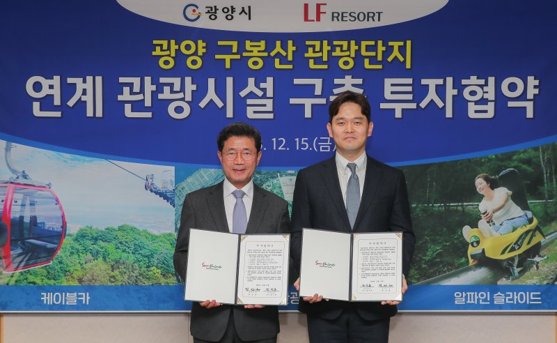 광양시는 15일 시청에서 정인화 광양시장과 ㈜LF리조트 김기준 대표이사, 관계자들이 참석한 가운데 ㈜LF리조트와 구봉산 관광단지 연계사업을 위한 투자협약을 체결했다고 밝혔다.