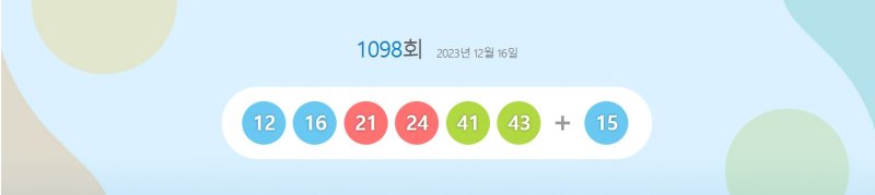 [서울=뉴시스]박광온 기자 = 16일 제1098회 동행복권 로또 추첨 결과 '12, 16, 21, 24, 41, 43'이 1등 당첨 번호로 결정됐다. 2등 보너스 번호는 '15'다.