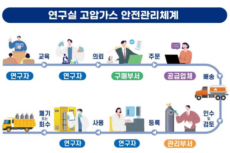 구매 단계에서는 고압가스 공급업체를 선정하고 연구자들에게 가스용기 취급 안전교육을 실시해야 한다. 사용 단계에서는 취급하는 가스의 안전기준을 검토하고 가스 정보를 등록해 수시로 관리현황을 확인해야 한다. 회수와 폐기 단계에서는 용기가 방치되지 않도록 공급업체를 통해 사용이 완료된 용기를 처리해야 한다.