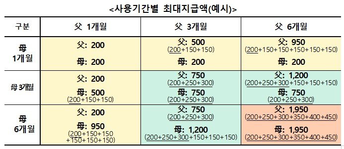 상한액도 1개월 차 200만원에서 2개월 차 250만원 등으로 월 50만원씩 상향돼 6개월 차엔 부모 각각 450만원씩으로 늘어난다.