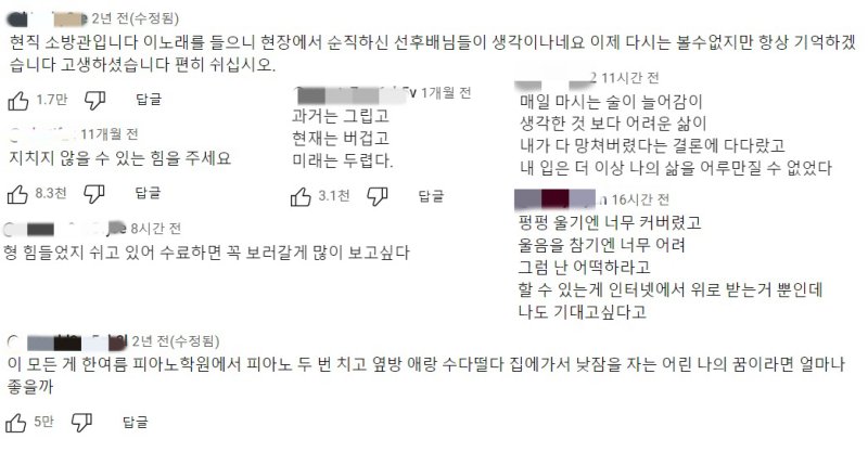 또 다른 누리꾼은 "무려 2년 전 영상임에도 불구하고 아직 이 영상에 찾아오는 사람들이 있다는 것이 슬픈 것 같다. 위로받고 싶어서, 아니면 슬픔을 떨쳐내고 싶어서 이 영상을 찾아왔을 것이라 생각한다"고 댓글을 남겼다.