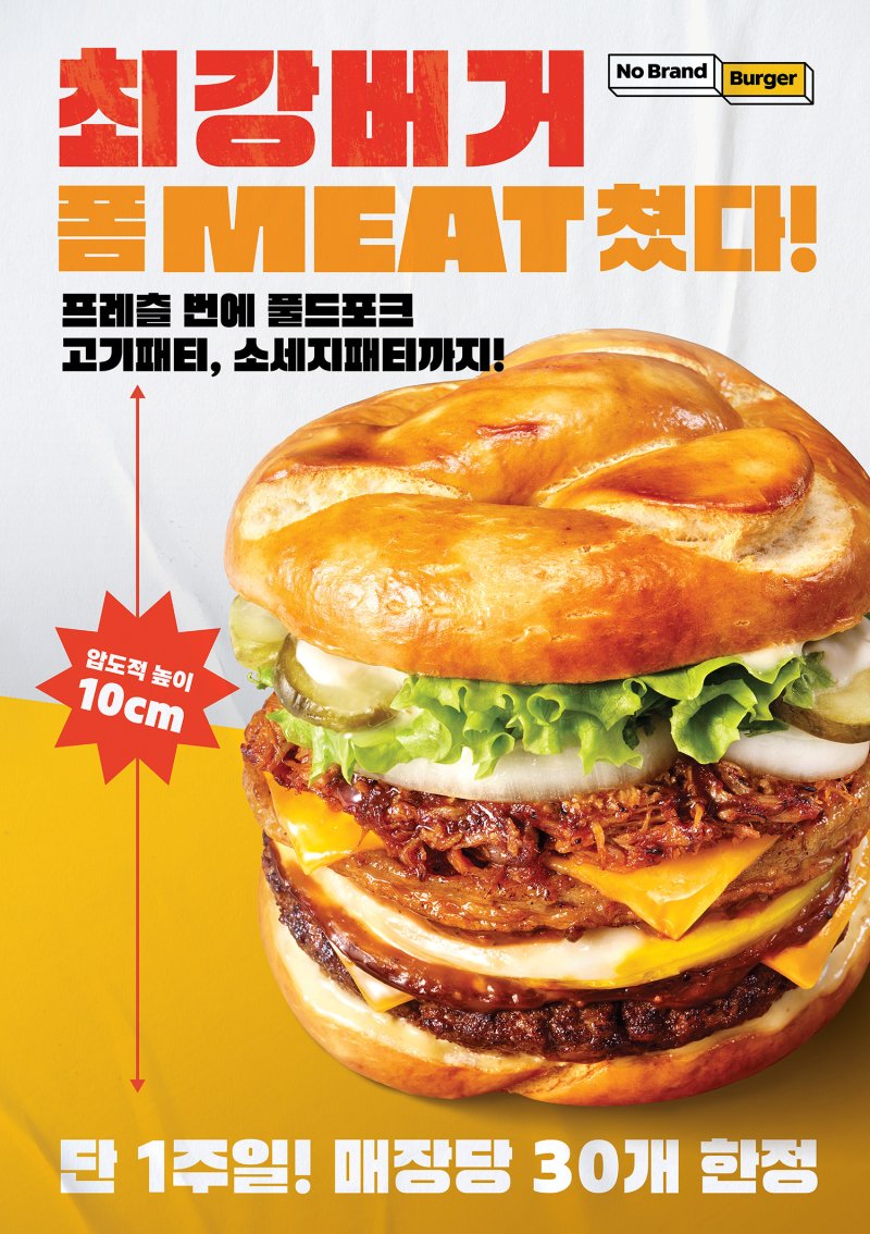노브랜드 버거의 최강버거는 이름처럼 높이가 10㎝에 달할 만큼 압도적인 크기와 노브랜드 평균 버거 무게의 2배인 419g 용량의 스펙을 자랑하는 이색적인 비주얼이 특징이다.