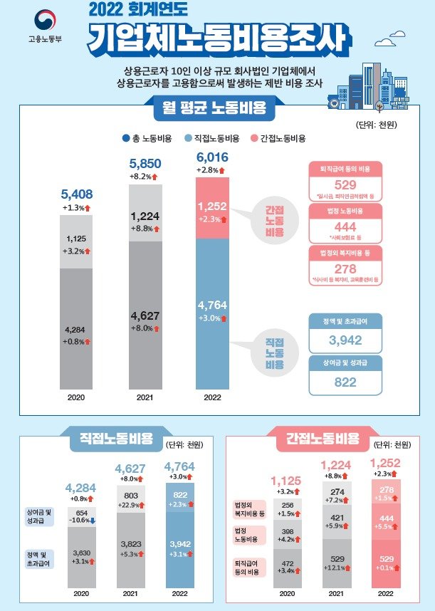 21일 고용노동부에 따르면 2022 회계연도 기준 상용 근로자 10인 이상 기업체의 상용 근로자 1인당 월평균 노동비용은 601만6000원이다.