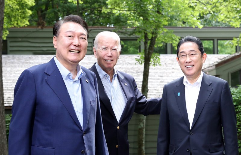 [서울=뉴시스] 김승민 기자 = 윤석열 대통령과 조 바이든 미국 대통령, 기시다 후미오 일본 총리는 지난 8월 미국 캠프 데이비드에 모여 결속을 다졌다. 3국 정상회의가 단독으로 열린 것은 이번이 최초다.