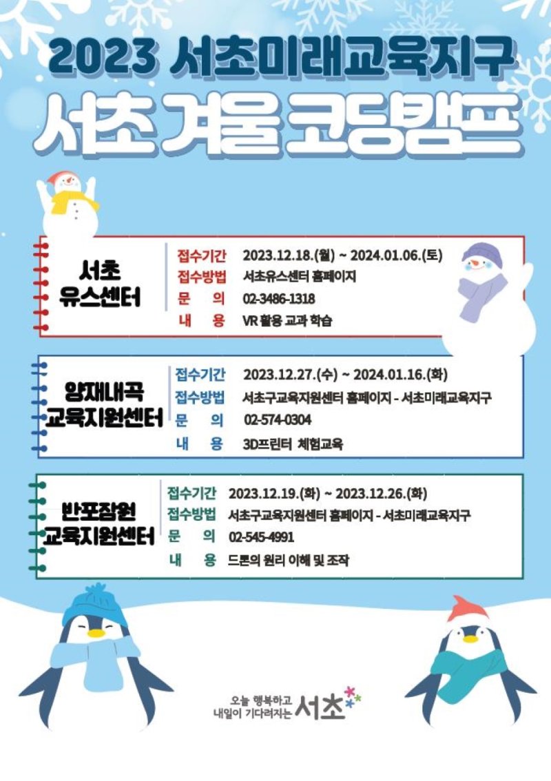 [서울=뉴시스] 권혁진 기자 = 서울 서초구가 겨울방학을 맞아 다음달 5일부터 초·중학생 대상 '서초 겨울 코딩캠프'를 진행한다고 24일 밝혔다.