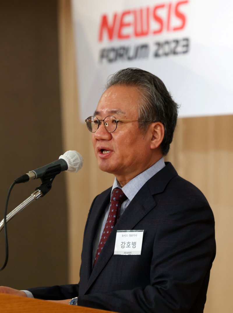 [세종=뉴시스]손차민 기자 = 강호병 뉴시스 대표이사는 28일 "우리나라는 국내에서 자생적으로 성장해 수출산업 비슷한 역할을 하는 플랫폼이 많아서 더욱 공정거래 정책이나 규제를 설계하기 어려운 면이 많다"고 밝혔다.