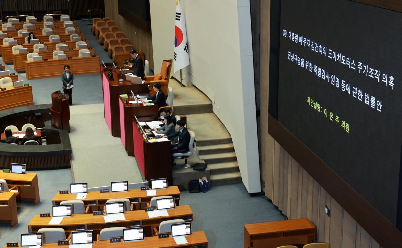 [서울=뉴시스] 신항섭 조성하 기자 = 여야가 28일 국회 본회의에서 쌍특검법(대장동 클럽·김건희 여사 주가 조작 의혹 특검)을 두고 다시 한번 공방을 벌였다.
