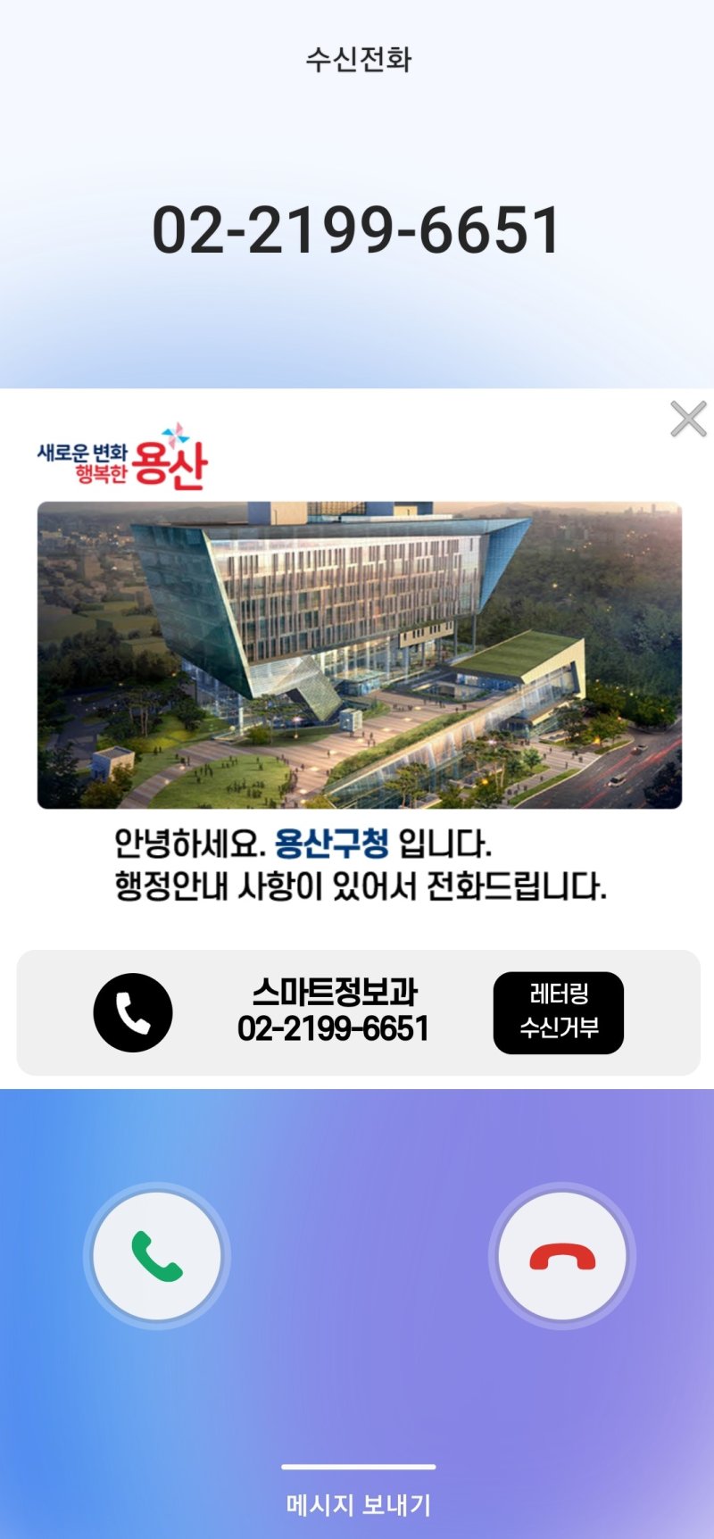 스마트폰 수신 화면에 용산구청 발신자 정보 표시