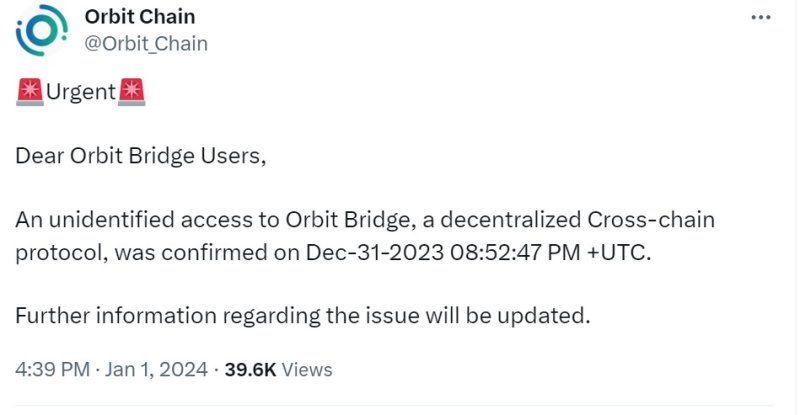 오르빗 브리지의 기반 네트워크인 오르빗체인 측은 지난 1일 오후 4시 39분 공식 X(구 트위터)를 통해 "세계협정시(UTC) 기준 2023년 12월 31일 오후 8시 52분 오르빗 브리지에서 확인되지 않은 접속 기록이 포착됐다"고 밝혔다.
