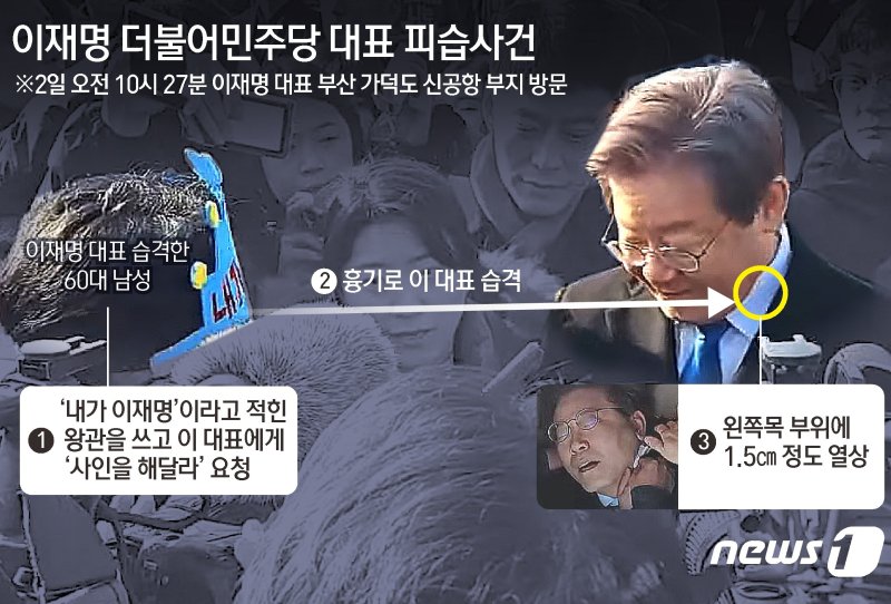 (서울·부산=뉴스1) 정재민 강수련 한병찬 기자 = 이재명 더불어민주당 대표가 2일 부산 현장 방문 일정에서 괴한으로부터 습격을 당했다. 이 대표는 이후 서울로 이송돼 2시간가량의 수술을 받은 뒤 회복 중이다.