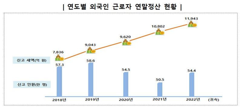 국세청은 2022년(귀속연도 기준) 연말정산 결과 외국인 근로자 신고인원은 54만4000명, 신고세액은 1조1943억원을 기록했다고 3일 밝혔다.