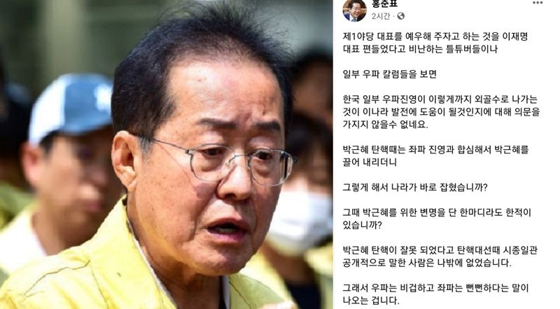 홍 시장은 “박근혜 (전 대통령) 탄핵 때는 좌파진영과 합심해 박근혜를 끌어내리더니 그렇게 해서 나라가 바로잡혔냐. 그때 박근혜를 위한 변명을 단 한마디라고 한 적 있느냐”라며 “‘박근혜 탄핵이 잘못됐다’고 탄핵대선 때 시종일관 공개적으로 말한 사람은 나 밖에 없었다”고 했다.