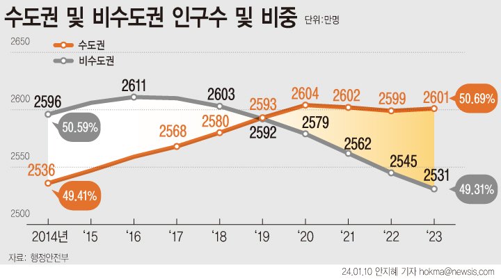 수도권 인구(2593만명)는 지난 2019년 처음 비수도권 인구(2592만명)를 앞지른 이후 해마다 격차를 키워왔다.