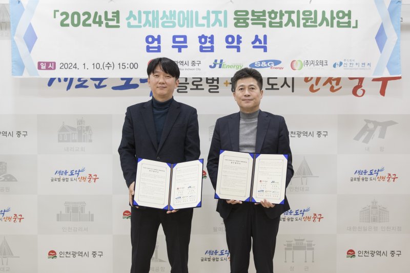 김정헌 중구청장은 이날 오후 중구청 구청장실에서 컨소시엄 기업 4곳(㈜제이에이치에너지, ㈜에스앤지에너지, ㈜지오테크, ㈜신한이엔씨)과 ‘2024년도 신재생에너지 융복합지원사업 추진을 위한 협약’을 체결했다.