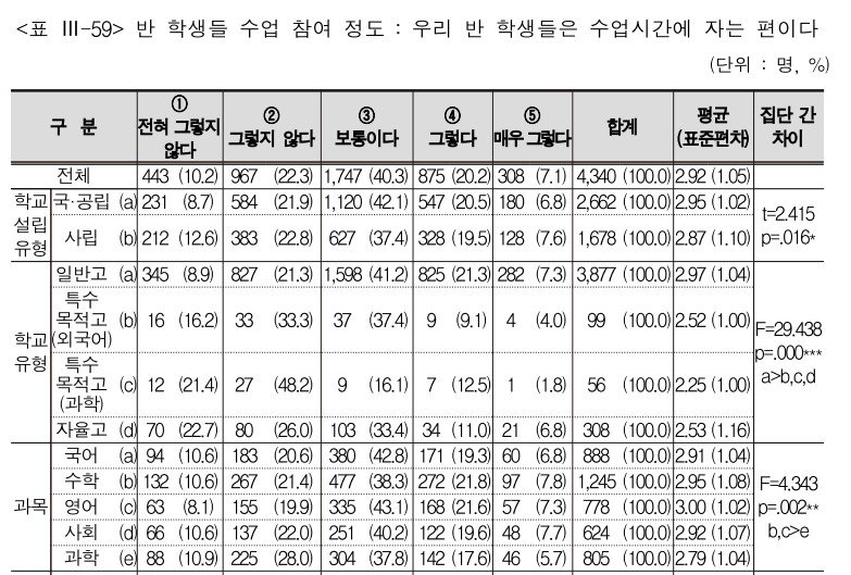 일반고 학생일수록 '수업 중 수면 분위기' 강하게 느껴