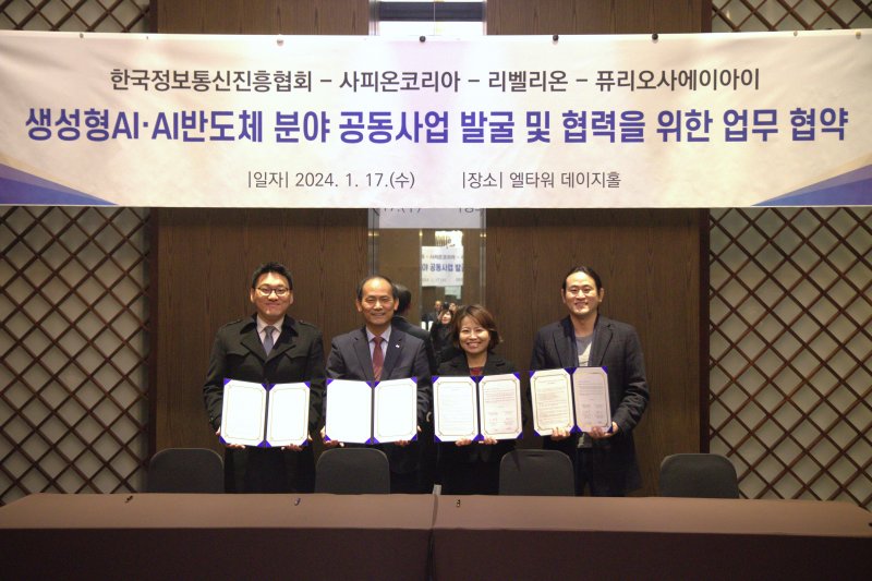 (서울=뉴스1) 양새롬 기자 = 한국정보통신진흥협회(KAIT)는 사피온코리아, 리벨리온, 퓨리오사AI와 생성형AI·AI반도체 분야 공동사업 발굴 및 협업을 위한 업무협약(MOU)을 체결했다고 17일 밝혔다.
