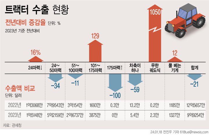 19일 관세청에 따르면 지난해 한국의 트랙터 수출은 9억9254만 달러(약 1조3300억원)로 집계됐다. 이는 사상 최대였던 2022년(12억5657만 달러)보다 21% 가량 줄어든 것이다.