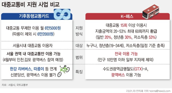 [서울=뉴시스] 조현아 기자 = 새해부터 대중교통비를 일정금액 이상 사용하면 할인받을 수 있는 대중교통 카드가 잇따라 도입된다. 서울시의 '기후동행카드', 국토교통부의 'K-패스', 경기도의 '더 경기패스' 등을 놓고 나에게 좀 더 맞는 대중교통 카드가 어떤 것인지 즐거운 선택이 시작된 셈이다.