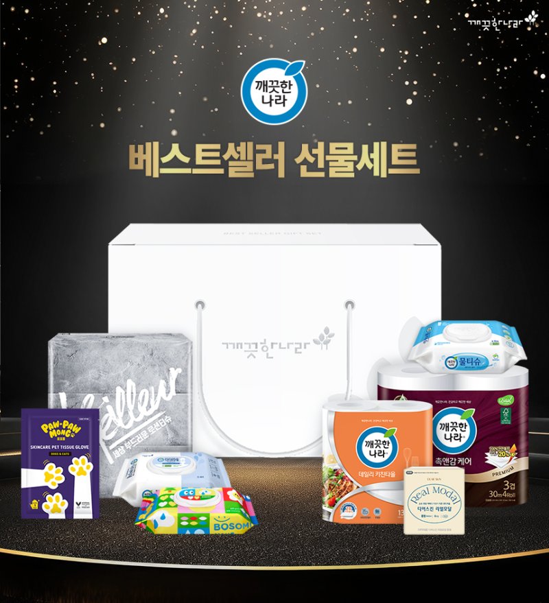 베스트셀러 선물세트는 △깨끗한나라 촉앤감케어 화장지 30m 4롤 △데일리 키친타월 130매 2롤 △르메이에르 로션티슈 200매 △페퍼민트 블루 캡 70매(물티슈) △닥터비데 화장실용 물티슈 캡 △보솜이 펀앤플레이 아기물티슈 슬림캡 30매 △디어스킨 리얼모달 생리대 중형 4p △포포몽 스킨케어 펫티슈 장갑형 등 8종으로 구성했다.