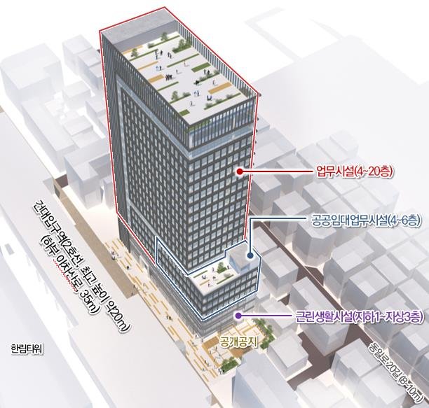 교통환경 개선과 공공의 필요시설에 대한 수요조사 결과를 반영해 대지와 접한 이면도로를 2m 확폭 조성하고, 건축물 일부에 공공임대업무시설을 설치할 계획이다.