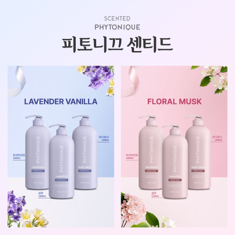피토니끄 센티드 라인업은 '라벤더 바닐라' '플로럴 머스크' 두 가지 향이며 각각 1000ml 대용량 샴푸와 트리트먼트, 바디워시로 출시했다. 지친 일상에 새로운 활력을 충전하는 여행의 순간을 모티브로, 자연에서 얻은 싱그러운 원료 고유의 향을 블렌딩해 섬세하게 조향했다.