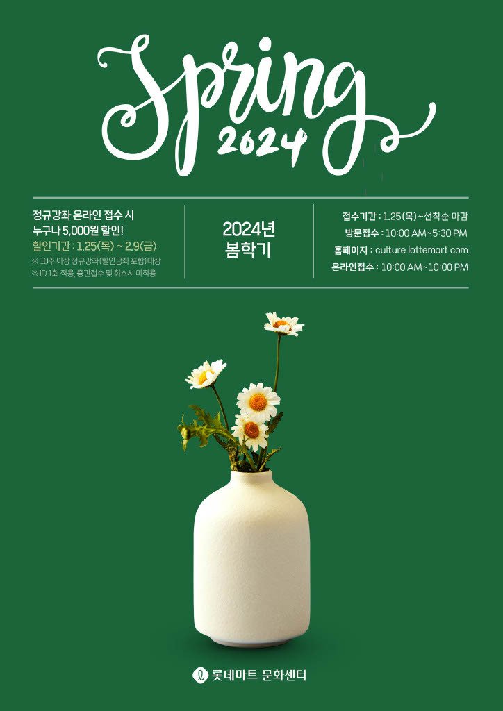 봄학기 강좌는 롯데마트 문화센터 전국 59개점 오프라인 매장 및 롯데마트 문화센터 홈페이지, 모바일 홈페이지를 통해 접수가능하다. 온라인으로 정규 강좌 접수 시 ID당 1회 기간별 이벤트를 진행해 2월9일까지 5000원 할인해준다.