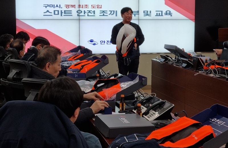 스마트 안전조끼는 추락사고 발생 시 센서가 작동해 장착된 에어백을 순식간에 팽창시켜 작업자의 머리와 목 등 상체를 보호하는 안전 장비로 경북 도내 최초로 도입됐다.