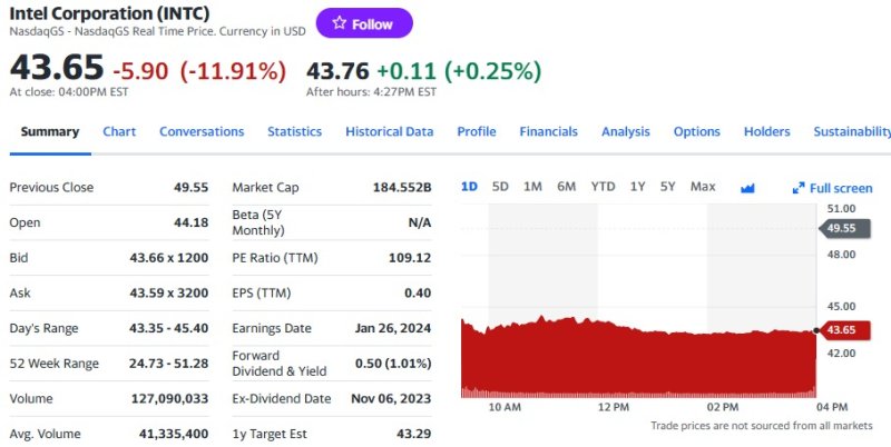26일(현지시간) 뉴욕증시에서 인텔은 전거래일보다 11.91% 폭락한 43.65달러를 기록했다.